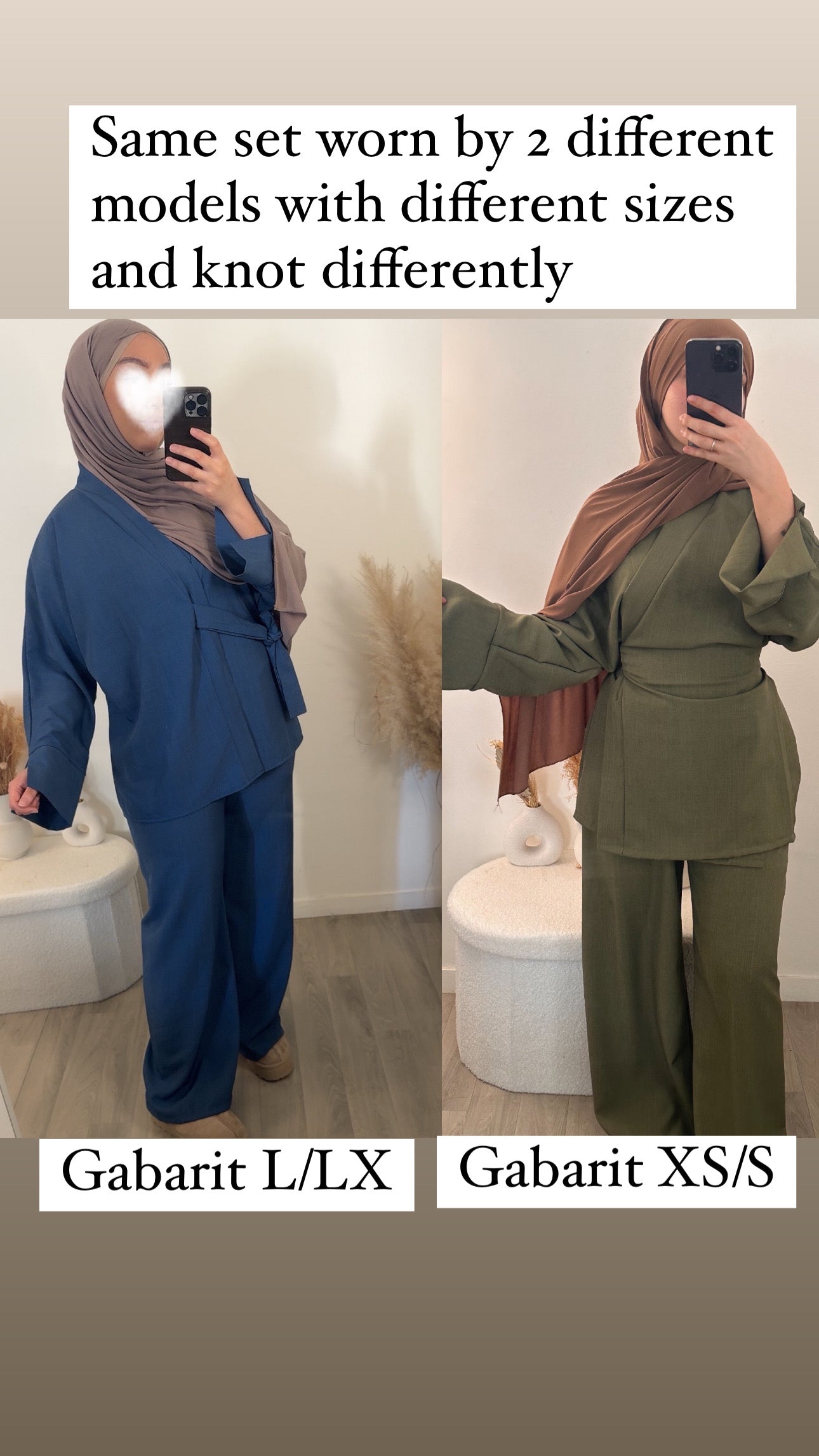 Parce qu’on pense à tout le monde et que notre objectif est de satisfaire tout les gabarits, nous avons shooter cette ensemble qui est une taille unique sur 2 model possédant des gabarit complètement diffèrent, afin que vous puissiez vous identifier et visualiser au maximum comment cette ensemble pourrait vous aller.
